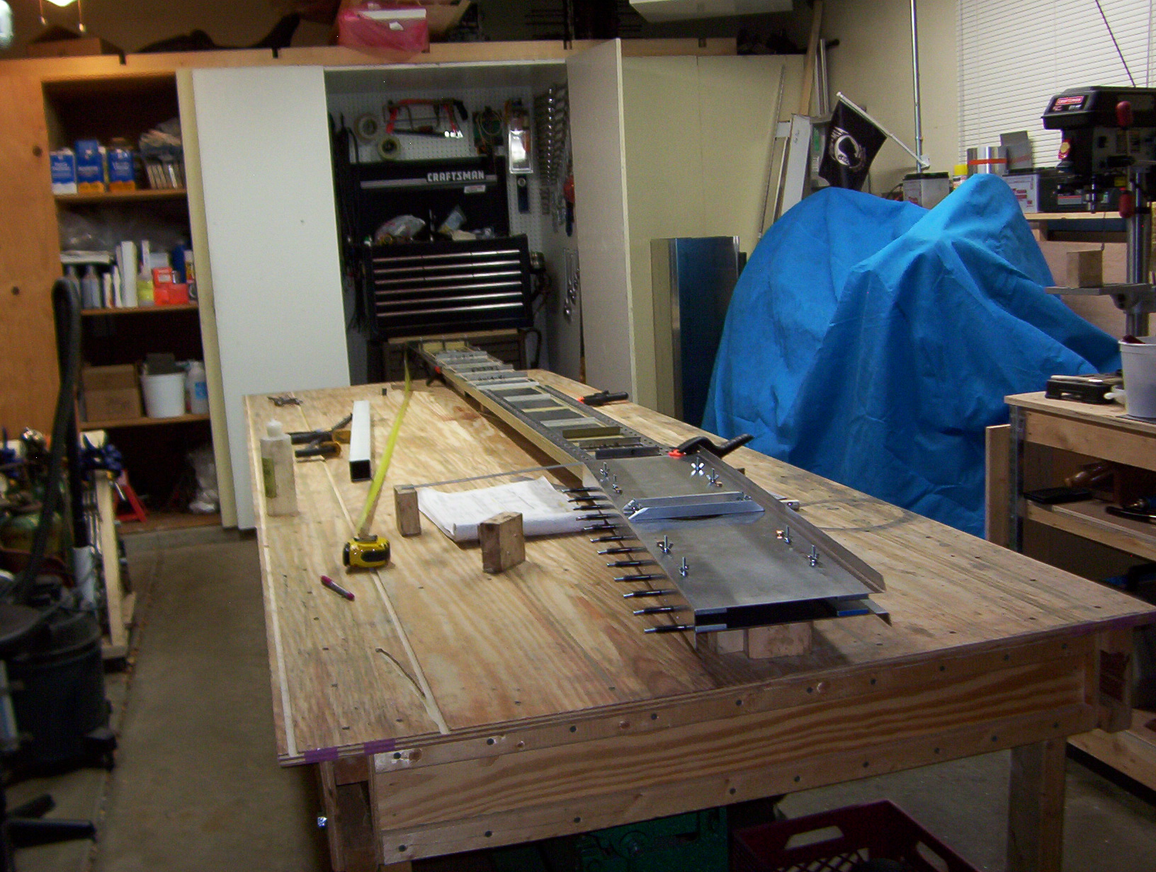 Here is the process I followed so far. Make all the forms first. Made the rudder, Stabilizer, Elevator w/trim tab, Made all the ribs for the Flaps and Ailerons, Form & Skin the flaps, Trim & Form all wing nose ribs, Form & Skin the Aileron, Form & trim all rear wing ribs, Layed out one wing spar web but made two (had them stacked), (Used the spar webs as the drilling template for the spar caps and cap angles, made both wing spars.), Made the Center Spars, Set Dihedral, Form both fuel tanks, Build up the left wing skeleton, Make both left and right top & bottom wing skins, The left wing is on the table and nearing completion. The right one will go a lot faster because much less going on inside it and many of the parts are already made.