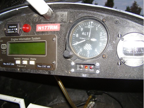 Never exceed speed for Mk ll is 80 mph according to the old construction booklet I acquired with my plane....Stall speed is about 37 mph for my little fatty, 424lbs dry plus Fuel and Pilot. Stall with passenger aboard is 40 mph...I gave a 5 mph yellow warning before stall and before 80 mph. We have a sign shop that builds signs for us at my work. I measured my airspeed indicator with a caliper and had him cut me three circles, red, yellow and green. He makes signs with vinyl and sticky backing. I carefully cut and applied the partial circles to my indicator......ELT is mounted on a aluminum plate I riveted to the two tubing members just behind the pilots seat. I had to move and reglue the mobile antenna on top as I have a strobe box just beside the elt. Elt remote is installed on panel. (see pic). The antenna was the tough one. I finally mounted it on the top of my aluminum gap seal using a generous doubler.......N number is on the boom tube....My inspection is scheduled for Thursday, 9-27-07. Keep fingers crossed for me!.......Mike