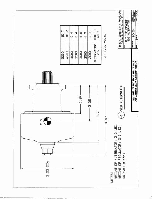 Attached is the info on the lightweight 10A alternator from B&C. This is the one on my Yak 55. The photos at the bottom show the unit as mounted on the upper back of the case. There are just 2 wires that leave the Alt going to the regulator, blue in the photo, just behind the right mag The regulator is mounted in front of the firewall on the right, below the oil tank and medial to the battery tray. There are 2 wires leaving the regulator red/blk that enter the wiring harness. I have not unwrapped the whole set of wires as the problem I had related to the 2A CB just before the bus. In my installation the Alt is not switched on the panel. The old "gen" switch is wired into to the main breaker panel and the CB for "gen" is pulled so the GenFailure light on the panel is not lit. The voltage meter in the cockpit is wired in as i can see if the Alt is not charging. I can also see a variable output with the engine speed. i do not pretend to know all of the facts, but reading the long discussions i am not sure mine is wired right since the switch is inop.