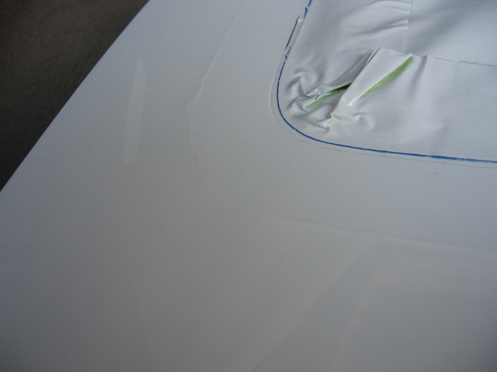 After painting the doors a small ridge developed above the Plexiglas-fiberglass joint - it is about 1/4 wide and 1/16 high. The area was level and smooth after priming. I used the Weld On 10 and put a thin layer of fiberglass over the seam. I then primed with UV SmoothPrime and primed over that with the Dupont high build primer. All looked good until we painted the final color and clear coat (Imron). It seems like some kind of chemical reaction.