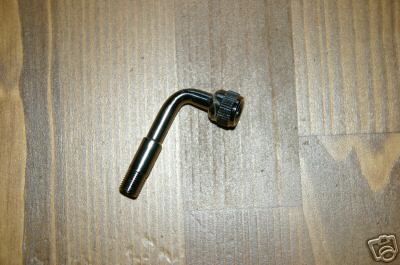 I found a 90 degree Schrader valve adapter but I am not sure that is a good solution as it will probably rub on the axel extension and may also be too long.