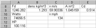 Note: You can convert the drag and power formulas to Engish units if you want, but I prefer to do everything in metric and convert afterwards. Note in the spreadsheet examples above