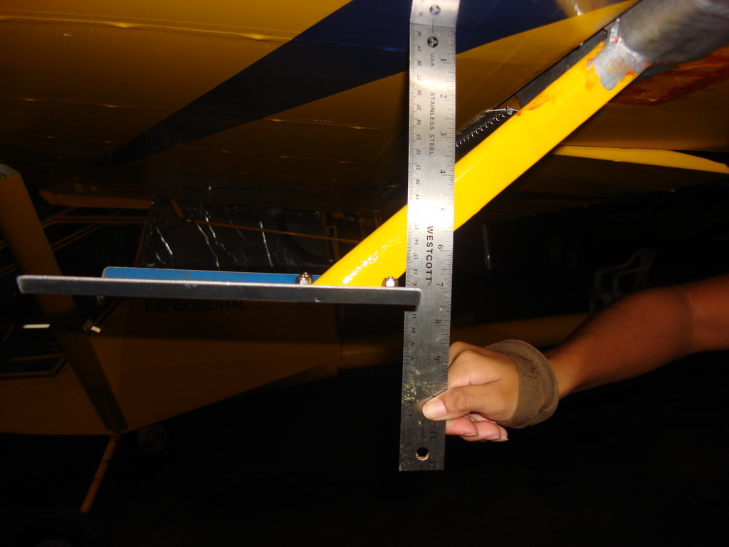 Attached are some more pictures, that show the size of the spades, and the 1/2 inch of the edge that is bent up at 45 degrees. The 45 degree bent edges reduce flexing under load, the spades should not flex at all in flight, I used 6061 T6 aluminum which is very stiff. I used washers to get the spades exactly level with the bottom of the aileron, within 1/3 of a degree, again this is important so that they do not act like trim tabs. The size can been seen from the ruler in the pictures.