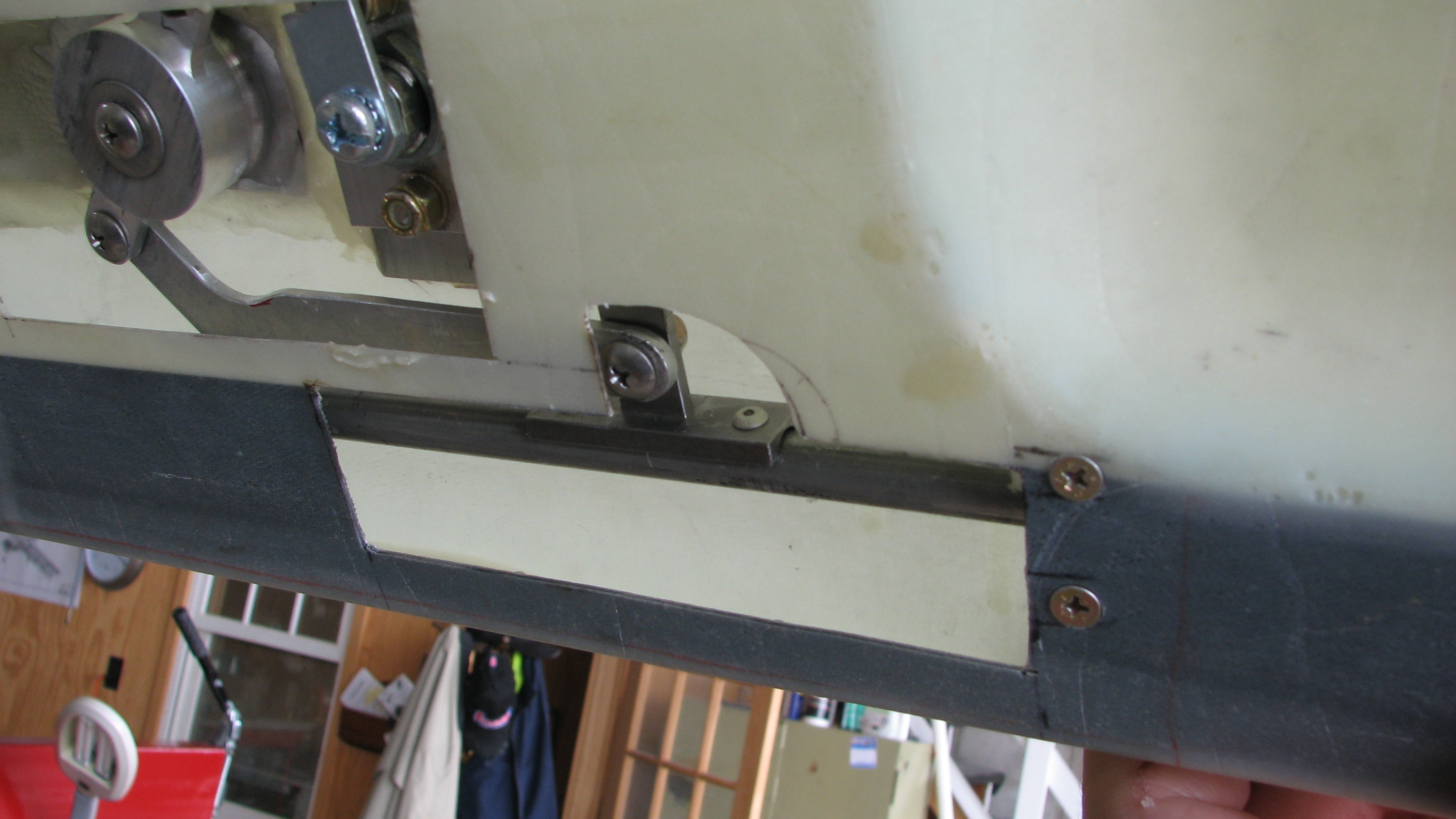 The fiberglass recess was slotted to allow the door lock arm to swing up and out of the way. It's hard to see the cut in the picture.