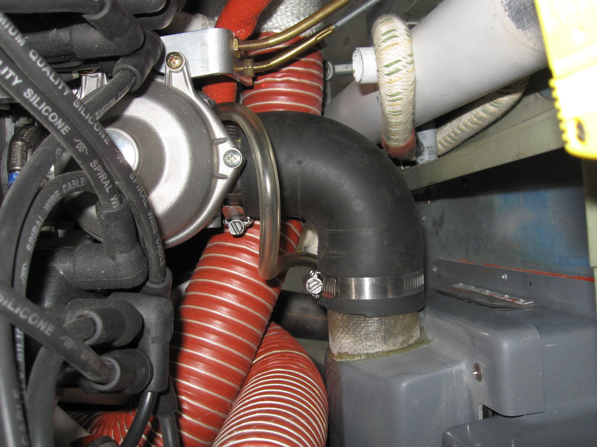 The hose geometry will depend on each airframe and FWF layout, of course, but FWIW, on my Murphy Rebel, with the std. mixer box mounted straight back of the engine and high, a Gates brand #20748 radiator hose fitting works well for turning the corner. The turn is a little wider than 90 deg., perhaps 105-110 deg. Another short piece of straight 2.25" hose completes the run up to a bottom exit from the mixer box.
