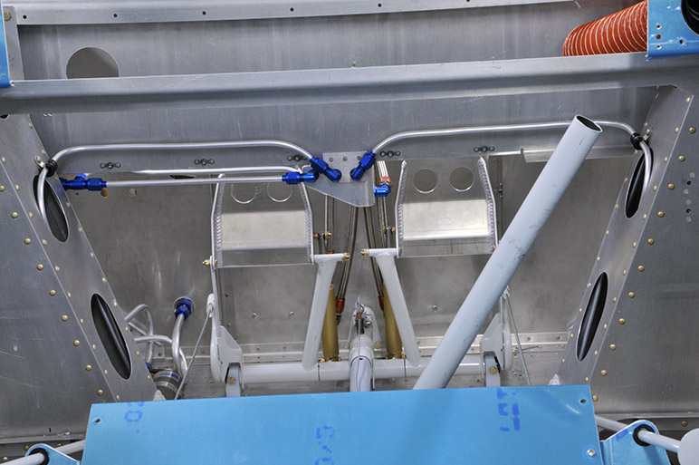 >After some head scratching and a couple more tries, I think I came up with a new design for the low pressure side of the brake lines. With this design, there is a steady slope downward from the reservoir to the master calendars. Seems to be pretty substantial. My only concern is that right feed line going through that candy cane piece isn't really supported anywhere. Its pretty short and solid to the touch, but vibration might cause a issue. Since the bottom floor of the baggage area goes over the top, there's really nothing permanent I can attach it to short of making a bracket of some kind (yuck).