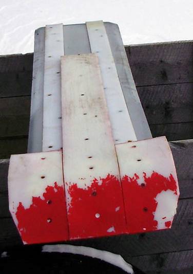 Picture 3. This angle shows the axel is straight and it also shows the two thin Teflon plastic runners on the bottom of the ski. Notice no whear bars as the skis are not to be used on bare pavement.