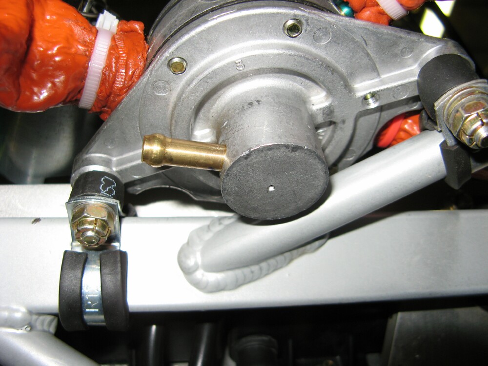 Personally I think it should be on the bottom of the casting, since I mount mine vertically. However it's actually in the brass elbow where the pulse line attaches. This means the pump is supposed to be mounted flat, with the logo up. Who does that? Some day I'll mic the existing hole, replace the elbow, and drill a new one the same size in the casting. Right now I suspect my pulse chamber is constantly 1/2 full of fuel/oil/whatever.
