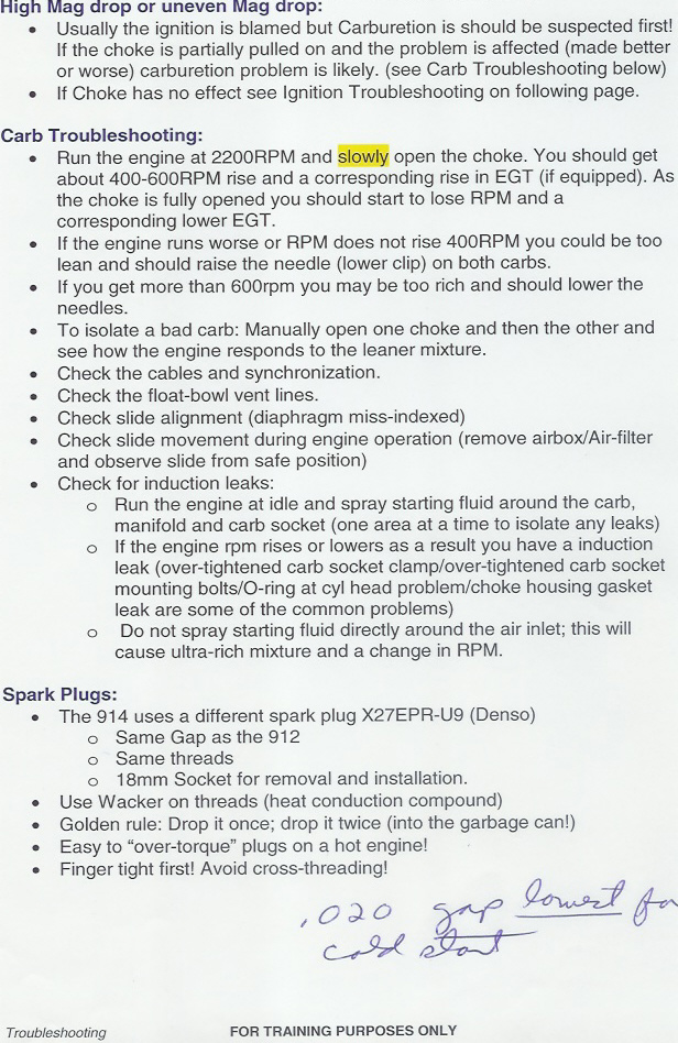 As for the carb related problems, With the engine at idle, servo locked out (reset switch held to eliminate the servo from operating), run the engine up until you see about 35-39 inches of MP. If the engine does not surge, it is not the carbs. If you have the dual manometers, and can watch the MP on each carb, that will tell you volumes about your carb health. If one of the altitude compensators is hanging up, the engine will sag, calling for more boost, then the engine boost clears the carb balance problem, but that causes a momentary over boost which then causes the servo to cut boost, which then causes the carbs to be out of balance again. In this case you will see it in the twin manometers and a carb rebuild kit for $45 will fix you up. The carbs on a 914 take about 2 hours to get on and off, and 1 hour to replace the seals in the carbs. Then you get to retune the throttles. Pay attention to the posit ion of the needle valve slide clip during the rebuild. If you get one position off, you will be running richer or leaner than normal. Bing has troubleshooting manual on the web and Rotax has the carb balancing video you can order, so check it out.