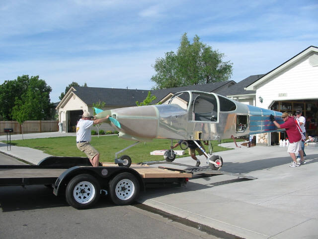 | Quote: | This week was something of a big transition for me. I had my last ever flight in an F-15 on Thursday (pictured below after being hosed do wn). And today I moved my RV-10 from my garage out to the hangar. I've been worry ing about how I was going to transport it as most trailers are only 6 feet wide. You can see I used a 4x8 sheet of 5/8 inch plywood strengthened by some 2x8 and 2x4 boards underneath to extend the trailer width out to 8' - perfect for the ge ar. It was easy to load and unload and traveled great.