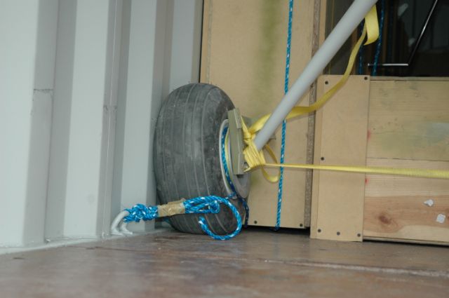 Since we’re on this subject, here’s a couple of pictures of our “truck” packing. Everything was in crates except the fuselage and HS, then very well secured several ways. The width of the gear was a press-fit into the container, but it did fit. We just lifted it up and in, but ramps would be nice also if you can keep them from sliding or falling off.