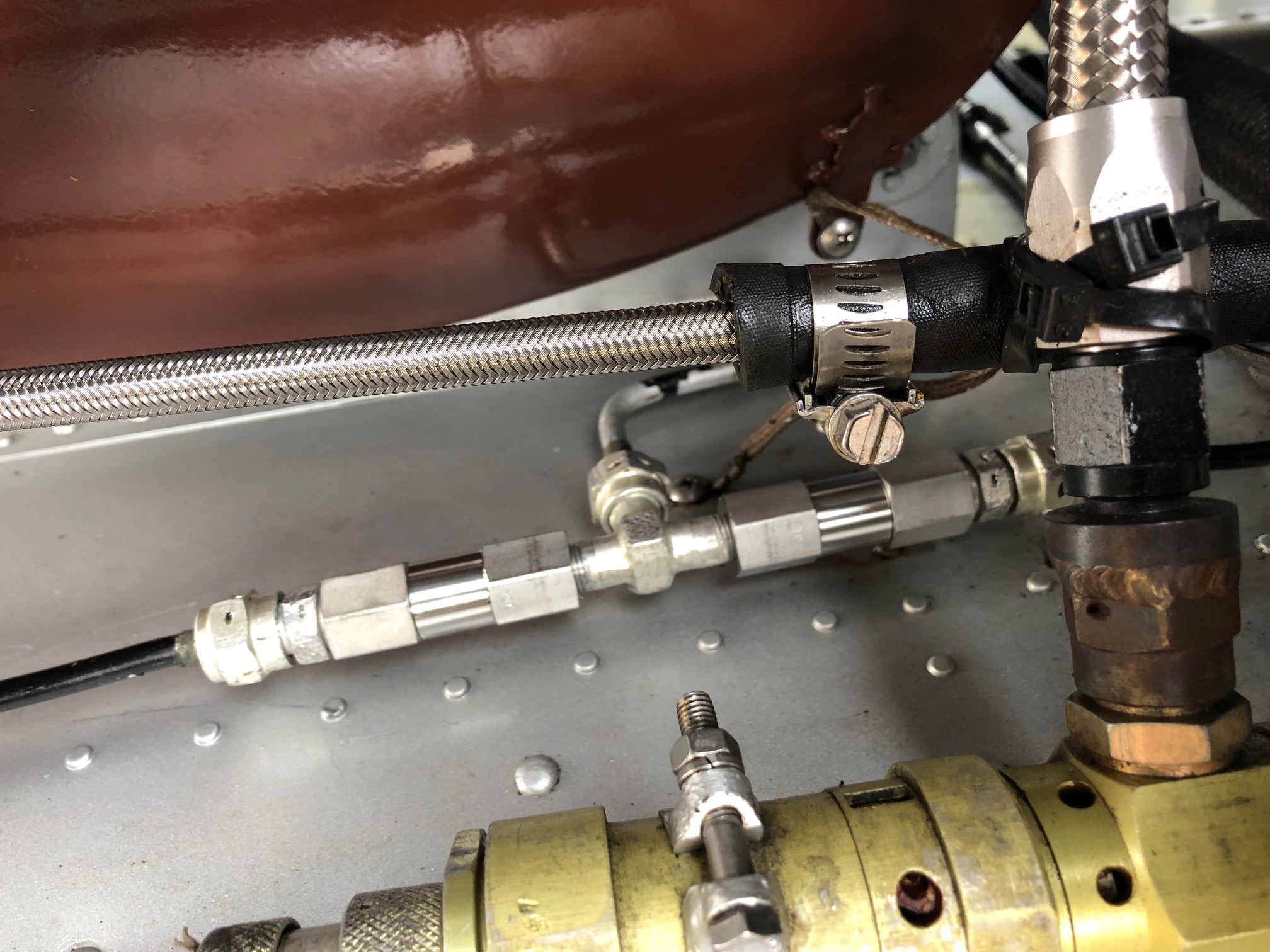 This is the T rebuild using CJ new SS check valves from Doug Sapp. You will have to wrap the valves with anti chaff tape to get the correct diameter when you anchor the adell clamps on the firewall. There is a L beam firewall stiffener that the B nut will chaff on if you do not put a chaff tape spacer on the check valve barrels.