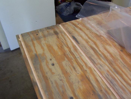 I did a little thinking here also, and figured the work table is real flat and stationary. Now what would be an easy way to move the part past the drill press? Here is what I did. Out came the router and I cut two long groves the length of the table. These are so the clecos don't snag when moving the parts. Next the visqueen goes on the table then the part goes on top of that. It slides real smooth and doesn't leave scratches.