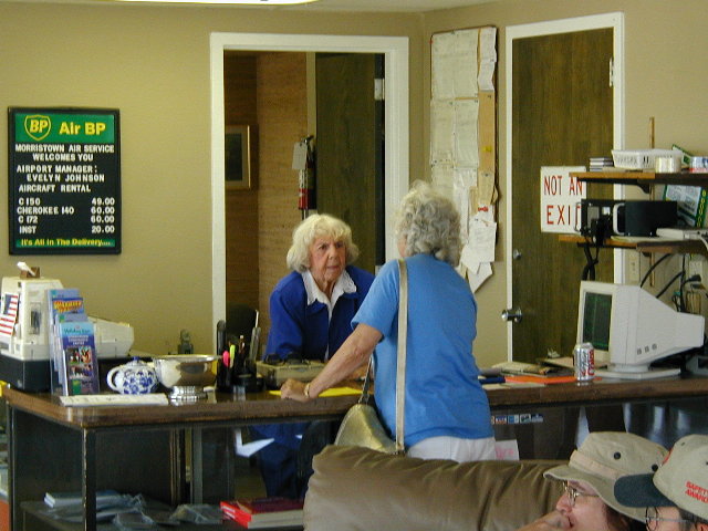 Here is a photo of Miss Evelyn behind the counter at Morristown airport where she could be found almost any day. I have visited her several times since she gave my checkride in Feb. 99. She is a very special person.