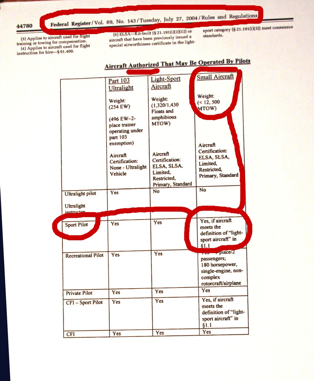 In this case, the FAA (the chart) is allowing any Small aircraft, that is, any aircraft 12,500 lbs or less, to attempt to meet the definition of “light-sport aircraft” Maybe they will, maybe they won’t. (12,500lbs is the cutoff between Small aircraft and Large aircraft. You must apply the definition, and the weight determination formula that is applicable and found in another FAA regulatory document to see if your particular aircraft is eligible to be operated under sport pilot privileges.
