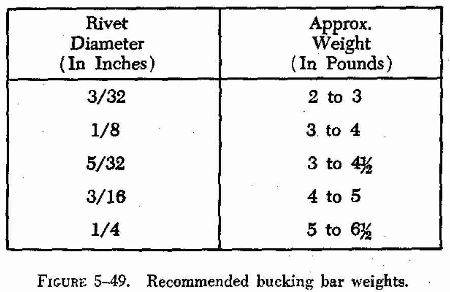if it is a wood frame floor it likely will do no good - still will recoil in the time frame of the rivet gun blow. The reccomended minimum weights for bucking bars related to the rivet diamet chart that I sent earlier deals directly withthis cause/effect and this is why in todays world you can buy tungsten bucking bars (if you are of the unlimited pocket sort!). http://www.johnston-tool.com/index.htm When you drive rivets in the conventional way with the gun in one hand and the bar in the other (or with a partner on the other side of the panel) you are exerting a counter force that is a supplement to the mass of the bar and allows the recoil to be managed to a greated degree.