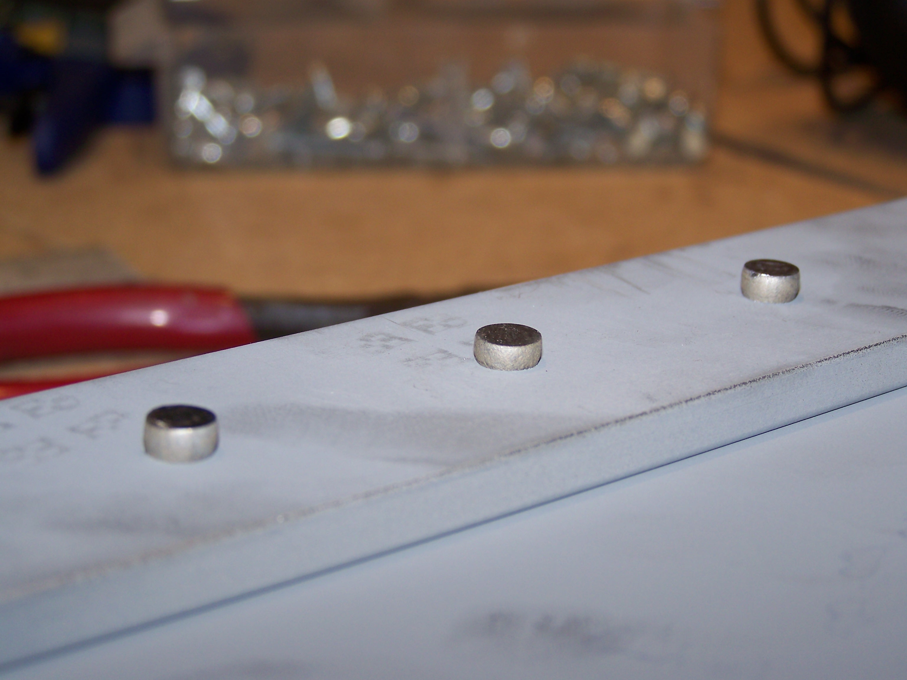 Thanks for the feedback guys. I think I'll leave them and maybe try to set a few of them a little more with the air hammer. The hammer may be a little anemic. But the results overall was pretty consistent. The spring set up helped alot with that. Check my website for details on that. The whole assembly sat on about 6 springs which let the rivet shophead just kiss the bucking bar. No cumbersome handling of the assembly was needed to move the setup closer to the bar as the rivet was set, just push from underneath with two fingers at first to keep the manufacturers head flush when first riveting, then once it starts to set, just push down with the rivet gun and the springs did their thing. Like I said, out of 150+, only two got messed up and that was because I goofed up with the gun briefly, once not letting go of the trigger before pulling the gun away, and once having the gun set on high for the large rivets and then forgetting to set the pressure back down and going back to doing small rivets, the gun jumped right off the rivet head. Otherwise, the other 99% look as you see them.
