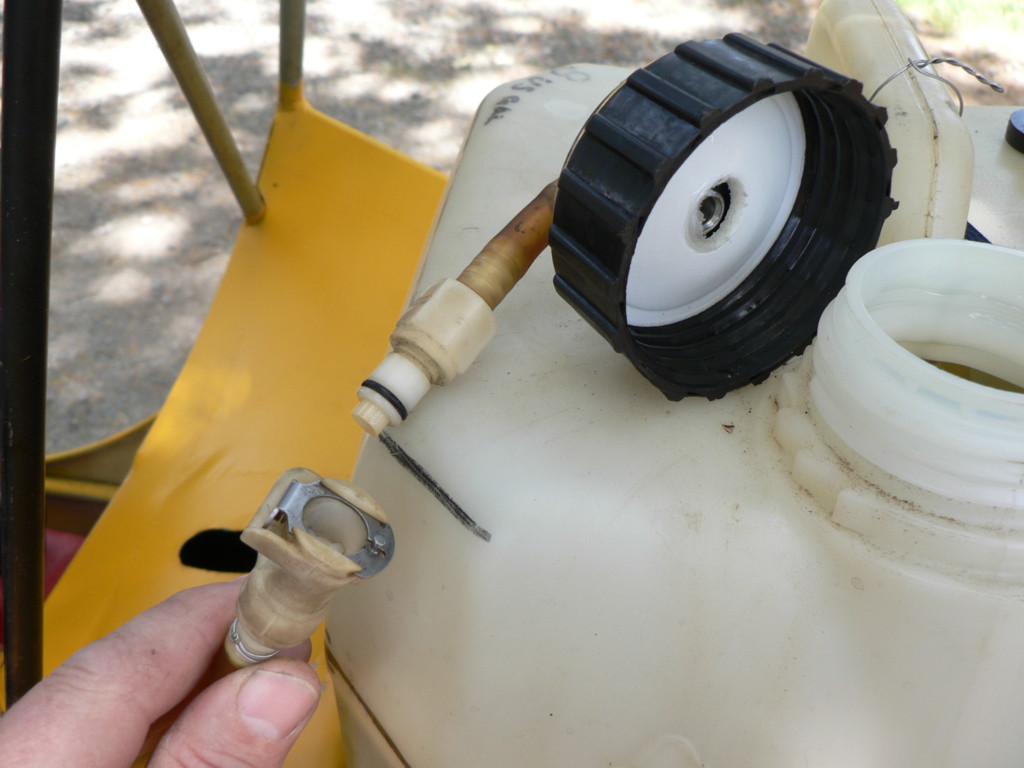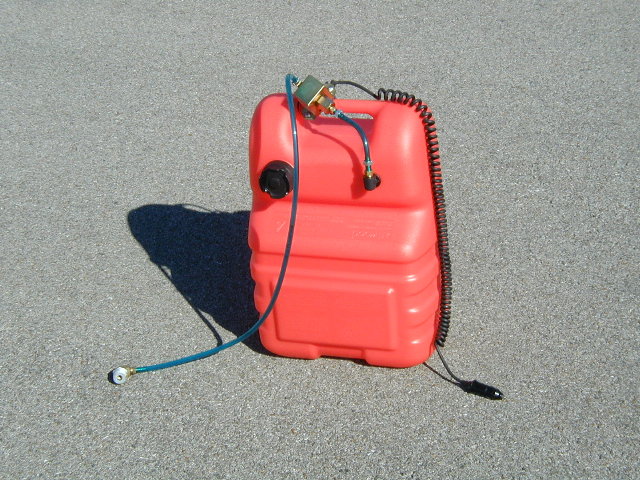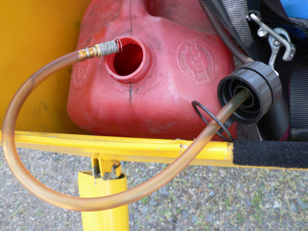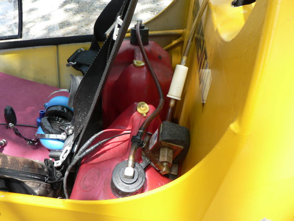 | Quote: | Before I built the 20 gal. aluminum tank for my Mark 3, this is what I used. It is a boat tank with the clunk/filter hose extended to reach the bottom of the tank when standing on end. The fuel pump is a faucet. I used it to transfer fuel in flight. It strapped into the passenger seat. I made a fitting that screwed into the 3/4" pipe thread in the cap of the plastic 5 gallon tanks. This fitting also provided a vent for the tank that I was pumping into.