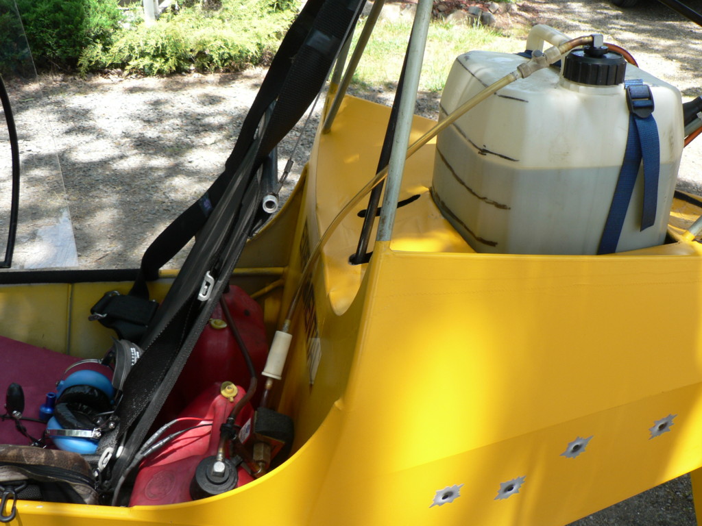 The main tank is sitting on the boom tube. It is an 8 gallon tank out of a Sky Ranger kit. They are under $30 and VERY sturdy. They are 1/2" fatter on the square than the standard tank and quite a bit taller. I had to move the 1/4" crossmember that holds the forward side of the tank to fit it in, but it was worth it for the extra few gallons. As for the bullet holes... You should have seen the other guy .