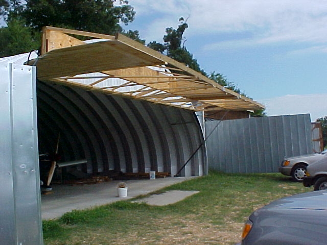 Here it is, the hangar door completely open. Minor sag at the junction of 2x4 on front-most edge and some torquing of metal beam at the ends where it meets the supporting post. Will stiffen with some plate and angle iron.