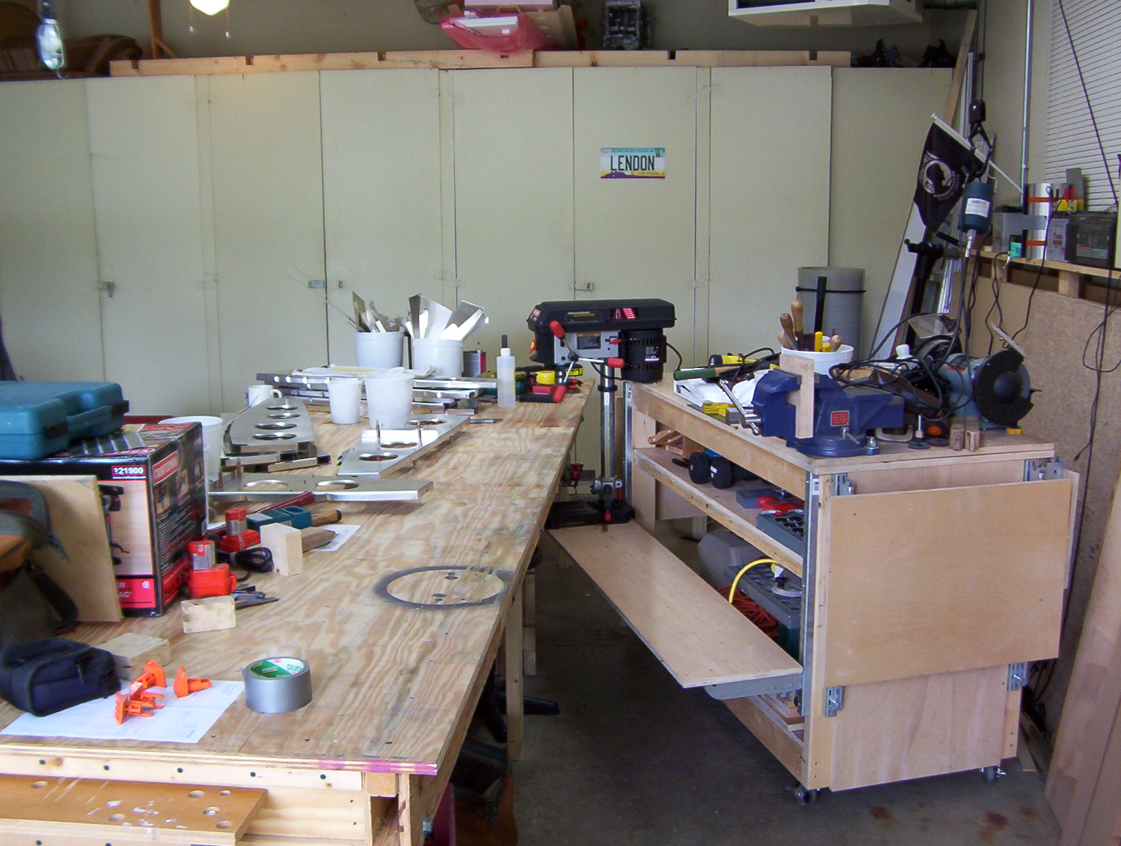 Below are 3 pictures of my shop, table & workbench. The workbench has adjustable shelves. Looks like I may not have to invert the base because it fits under the table. I may have to use several positions, and tram in the spindle at each location.