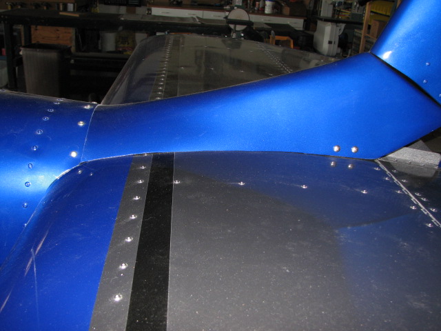 A week back there were many posts about fitting the Stb. with the rear skin in place. Some said it could be done and others said no way. I wrote in about my HDS and a friends HD and said both Stabs. could be put on with the rear skin on. Both were build just like the plans said. Tape was put on the rear skin inside the cut-out to keep the paint from scratching. The Stab. was slid in place at a slight up-right angle and then lowered in place. It takes two people and a little bit of care. I said when I get out to the airport I would take some pictures of our planes. (See attached pics.)
