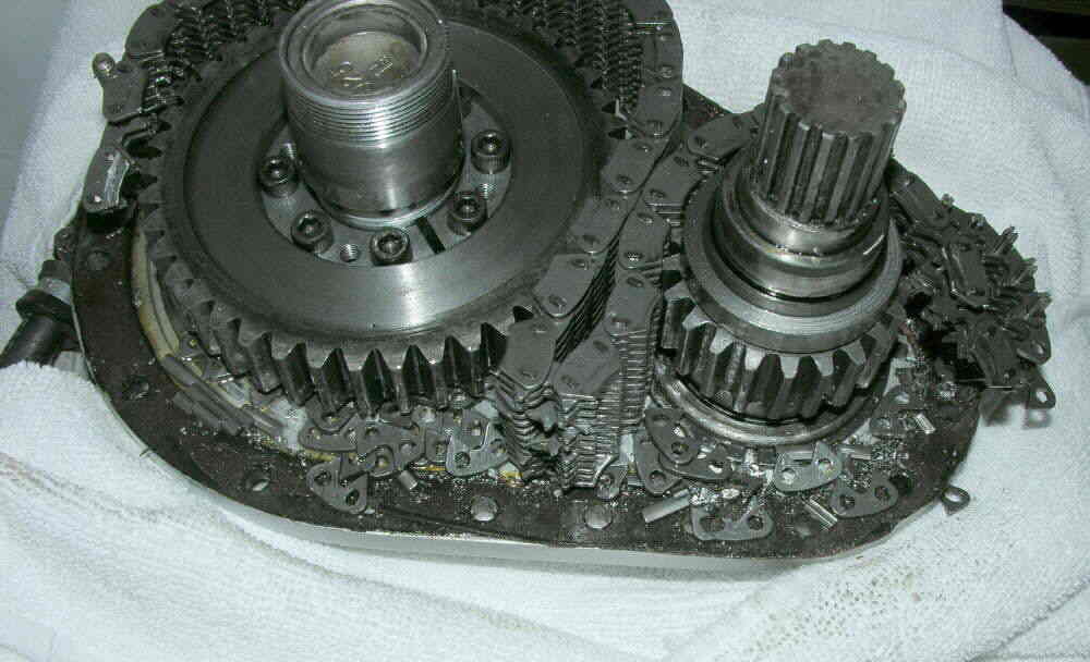 So, I bolted the prop back on, safety wired it, and lit 'er up. The engine started to fire, then backfired or kicked back - or both - and there was a loud bang and a jolt and the engine stopped. Hitting the starter didn't even wiggle the prop, so I shut everything off and tried hand propping it. Wouldn't move, so I tore that s.o.b. redrive off - again - and tore it apart - again. Here's a picture of what I found. That chain literally exploded. I think that's more than a great plenty. I've stubbornly worked thru several issues with that thing, and that's enuf. I don't want to fly in front of it, so it goes in the trash.