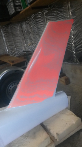 The fuselage is carbon fiber, with the fin, rudder post and rudder intentionally made of glass fiber (shown in red below) :