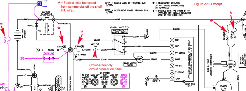 | Quote: | | But in diagram Z12 I still don't see a fusible link in the circuit that feeds the alternator field. What am I missing? I see a 5A field breaker at the main power buss. From there a 20AWG wire feeds tab 5 of the master switch. From tab 4 of the master switch a 20AWG wire feeds pin 6 of the B and C LR-3 controller. A 20AWG wire from pin 4 of the controller feeds the alternator field. I don't see a fusible link in this circuit as I do in diagram Z11. The system in Z11 uses fuses and Z12 used CB's. Does this make any difference? |