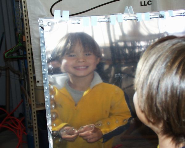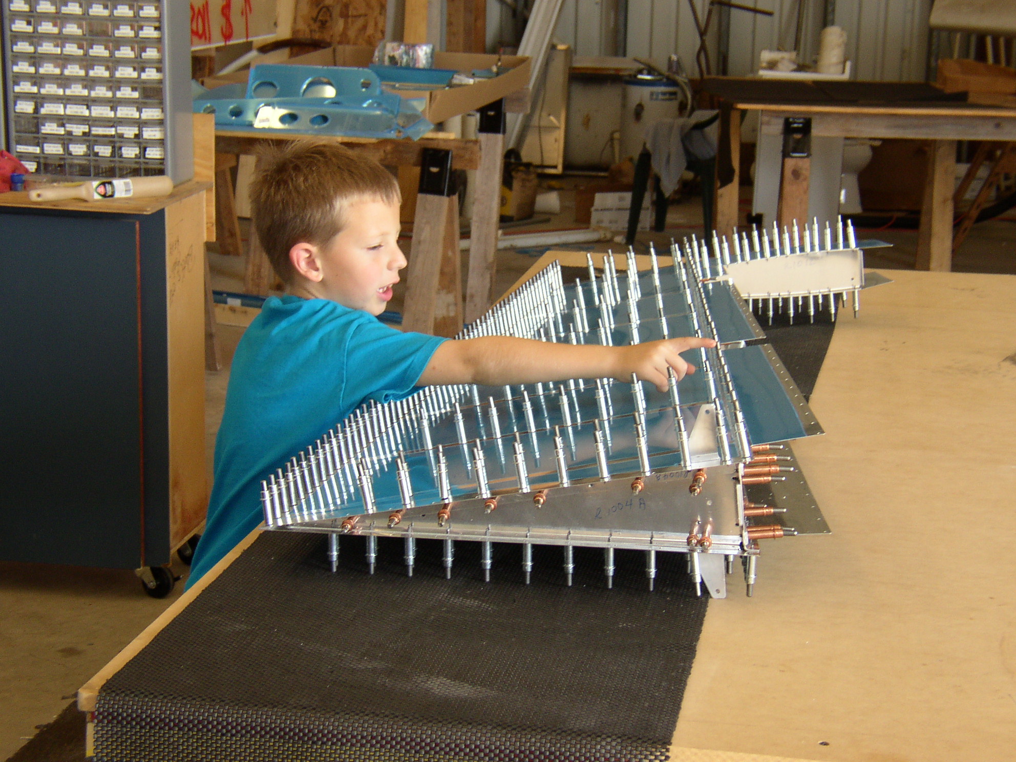 Mine (7) recently helped me pick a bolt out from between the skin and inner panel below the door sill. This picture is a couple years old. He was going behind me putting tape tabs on the rivets as I filled the holes.