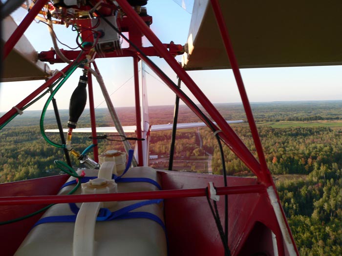 I took this rear view picture while flying my plane over the Upper Peninsula of Michgan. You can see the redish blur of my red IVO Prop.