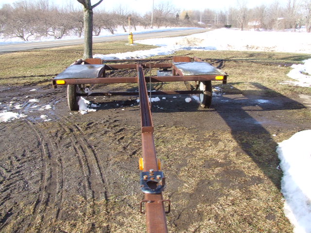 Now the rear view: The ramps are left and right, supported by the pipe lock which slides thru the rear ramp tubes, providing support during transport. Detail later. The plywood decks actually have a hinged portion, not on the trailer now, which fold down to the rear, covering the ramps. This allows surface for the floats to rest on. When the plane is on wheels or skis, the rear decks fold back on the front decks and are secured with a 1/4inch bolt.