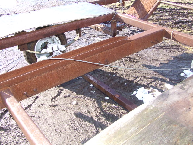 Looking at the rear crossmember, you can see where the tougue beam ( 6 in X 2 in ) is welded in place. I left the bottom open for two reasons; 1. I can feed my electrical wires thru it and 2. it lets the inevitable water drain out. You can see here where the tailwheel guide starts and the tiedown rings are located.