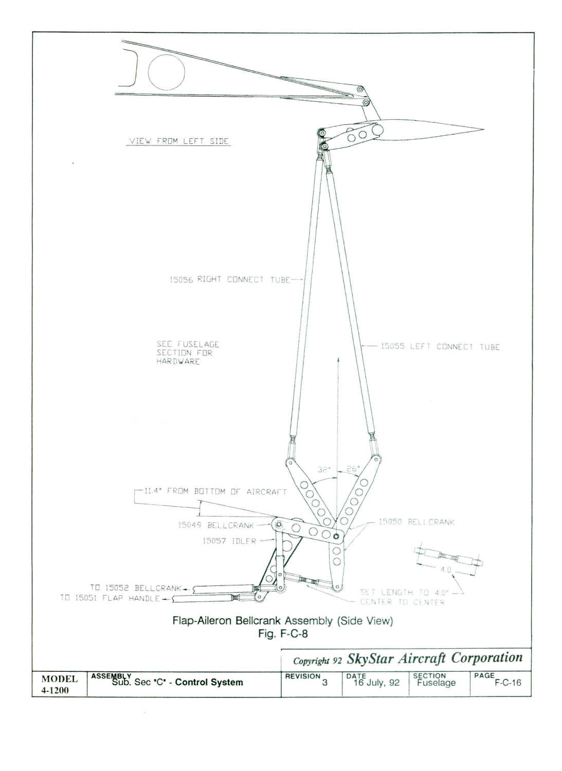 If you need to adjust the elevator limits: For up elevator limit, adjust the rod ends in the elevator tube assembly so that the rear rod end contacts the tail post at the same time the stick contacts the seat. Should be 30 to 35 degrees compared to the horizontal stab. You will have plenty of down elevator. The down elevator stop is a small tube welded across the fuselage a couple inches ahead of the tail post. No adjustment on that.