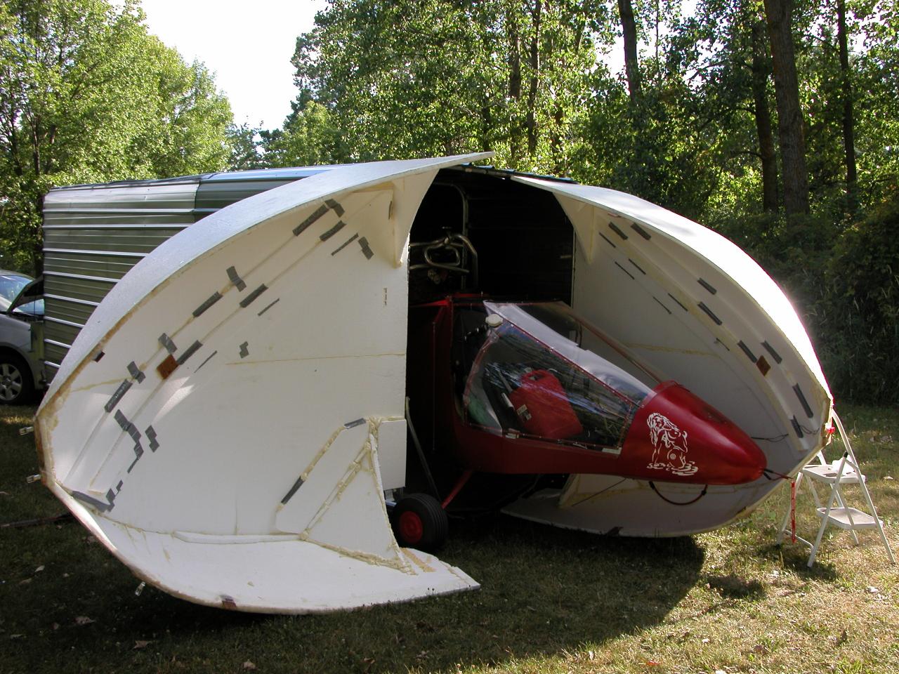 Due to the recent change of reduction drive on my VW powered MKIIIC I decided to trailer my plane to Scott Trask's in Iron Mountain. MI and fly in to Oshkosh from there. I got busy and finished up my trailer and loaded it up for the first time today. The attached photo is the plane loaded with one of the clam shell doors open. Note I have removed the trailer wheels for loading. I will be posting the trailer on George Alexander web site when I get back. I will be heading out Sunday with the trailer/plane and flying into Oshkosh on Monday.