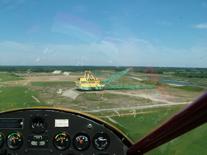 This is a huge drag line in Kentucky on a reclaimed coal strip mine. Never really knew how large they were until I landed on the gravel road next to it, and taxiied up under the operator's cab. Estimate the main boom is over 300 feet long.
