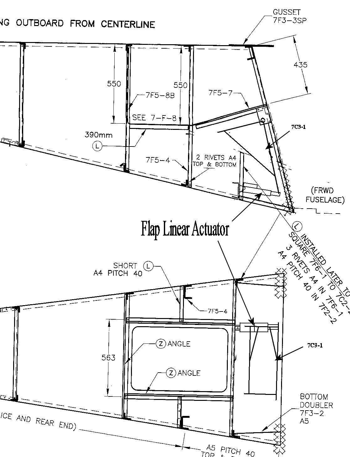 I decided to mount the flap motor on the front of 7F6-1 in line with the bottom of the flaperon control mount. It is bolted to the Flaperon control mount with an AN4-20 in the same place the flaperon control lever would normally go. The position is ideal because it allows easy access and maintenance to the motor through the rear access panel. I ran the idea past ZAC and they suggested adding a doubler to reinforce the channel 7F6-1 and a gusset between 7F6-1 and the z bracket around the access hole. This is to prevent twisting of the channel during flap operation.