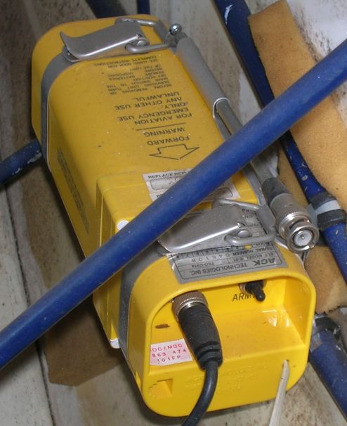 One note on ELT's. The cable going to the panel switch seems to be designed for mounting in the extreme aft of something the size of a B-52. I see a lot of installations, like mine, that has the excess cable wadded up and nylon tied. As you can see from the picture, the cable on this model comes straight out of the case. I have an ACK 450 for my FireStar that has a phone plug so the cable can be replaced. Unfortunately, I can't just substitute a phone cord more near the length required. Phone cords run straight through from plug to plug. ELT cords have a 180 twist so that, for instance, if the red wire is connected to the first terminal on one end, it's connected to first terminal on the other end, too, whereas on a phone cord it would be connected to the fourth terminal.
