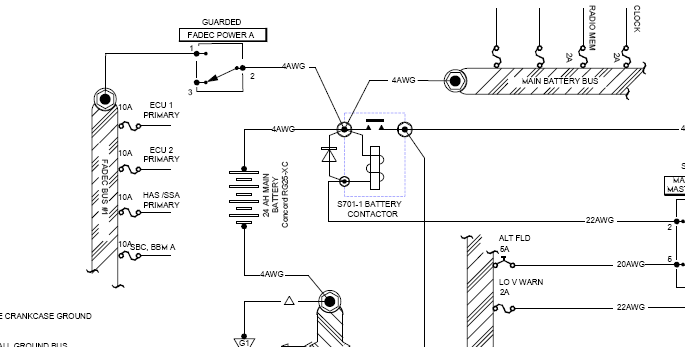 I am currently working on my wiring diagram for my FADEC equipped plane. I will be using a slightly modified version of the Z-14 diagram. I found a fellow builder with the same setup as me and got a hold of his wiring diagram. Attached is a snippet of that diagram. My question pertains to the guarded switch for FADEC bus #1 (there is a similar setup for FADEC bus #2). The diagram is showing 4 AWG wire between the battery and guarded switch. Shouldn’t there be a relay or something here?