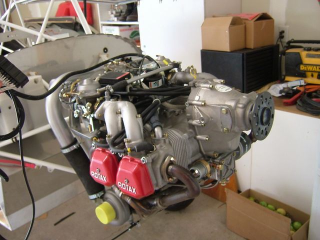 Well, I never thought the day would come but here it is...the 914 arrived on Friday and I had it hung on Saturday. It is a beauty thats for sure! One problem...I was shorted the turbo control unit! When you fork over this kind of cash, you hope that everything is there. I called the company I bought it from and they are working on getting it for me so its not a big problem but it kind of kills the excitement a bit. Now that the engine is hung, I am moving into the electric install and panel so anyone who wants to drop by to help out (electrical systems scare me) is more than welcome.