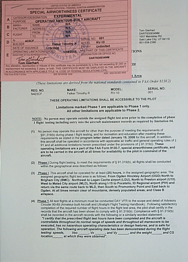 [quote]After just over three years of construction N423CF received it’s special airworthiness certificate today. I would like to thank everyone on the list for all the help. I am still a month or so away from flying, but it sure feels good to have the pink slip. I am scheduled for Training 21/22 Feb……….then to the air it goes.