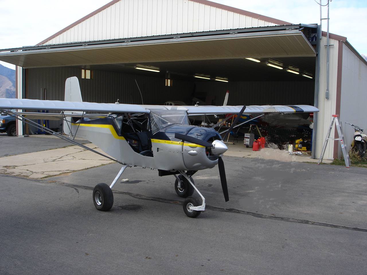 Today was the day. The snow has finally melted enough to get the hanger door open. The runway has been plowed (however there is still about 3 feet of snow on both sides). I took the brand new 85DD rebuilt Kitfox I-IV Nosewheel (I call it that because of all the model IV mods we have installed) and taxied for 0.8 hours. First slowly, then about 30 mph and then did several wheelies down the runway at about 40 to 55 mph [Shocked] . Did a few slight lift offs, keeping the plane just a few inches above the runway, then settled back to earth [Laughing] . She seems to have lots of power and [quote][b]