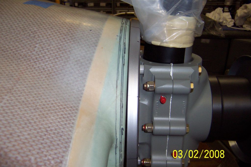 Third picture. Now comes the prop and with nothing different,….the gap closed to 0 at the top and 1/4 at the bottom. No doubt about it, the spacer was simply too long. It should have been no more that 2 1/8 to 2 1/16 to leave a little fill room. 2.00 might be perfect if you plan to true up the face later. It the spacer is too long, it causes you to fit the cowl further out from the firewall than it should be.