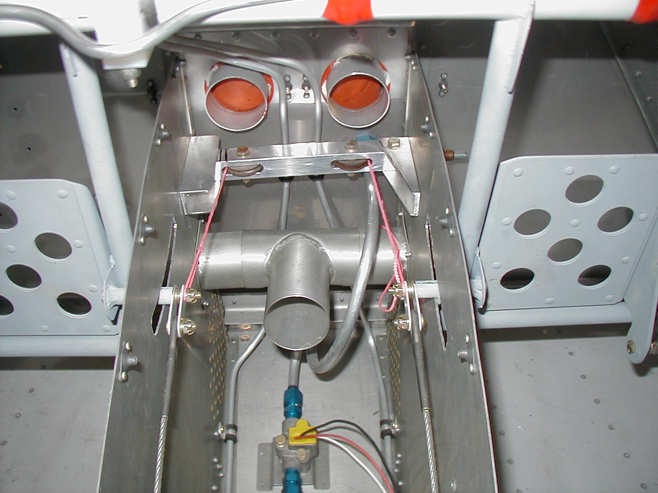 You can see the mod I made to the rudder cable attachment ..... it's inside the tunnel. I don't like sandy (in FL) shoes smacking the rudder cables so I moved them inside the tunnel. It would be simpler to make brackets for the pulleys and put them on the outside of the tunnel, running the cable through the tunnel just under the heater valves.