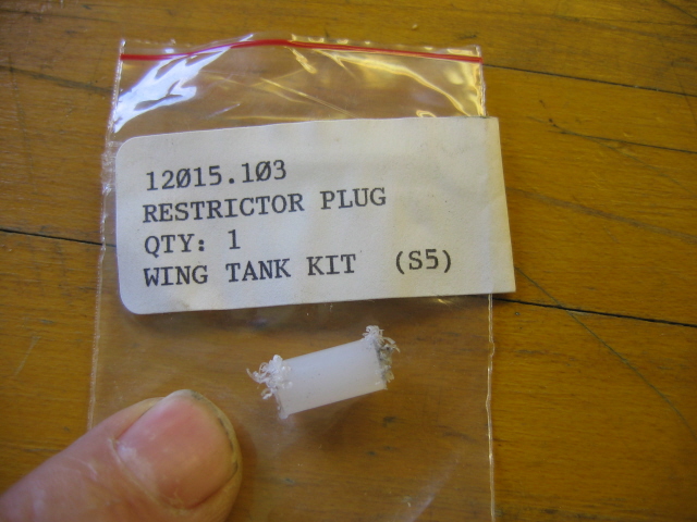 The plastic restricter plug goes in the sight tube to dampen the sloshing of the fuel in the tube. I think there was no hole in it and the builder needs to drill about a 1/16th in. hole lengthwise in the plug.