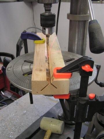 Here is what I did to get 4 perfect rod ends: - First I made a V channel holder (see P1010015.JPG) as suggested by Carl. This I aligned on my drill press so that the drilled would always go through the centerline of a tube and clamped in place.