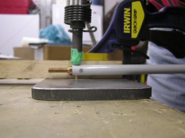 - Drill the #40 pilot hole with the rod end in place. Care must be taken to ensure that the rod end does not "wander" out of the tube when drilling. Prevent this by holding the rod end in place by hand when drilling. I also clamped the tube in the V channel to ensure it did not move.