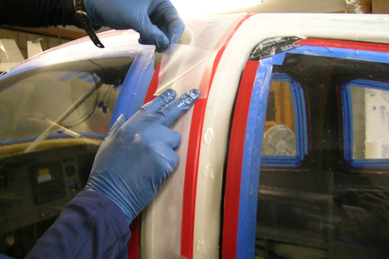 Peel back the backing plastic and transfer to the plane. Once on the plane C remove the top layer. Use the brush to work the edge of the cloth to the tape line.