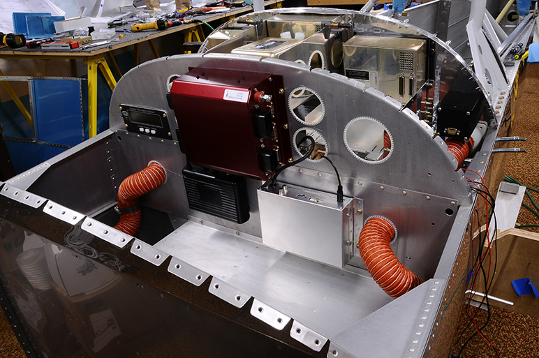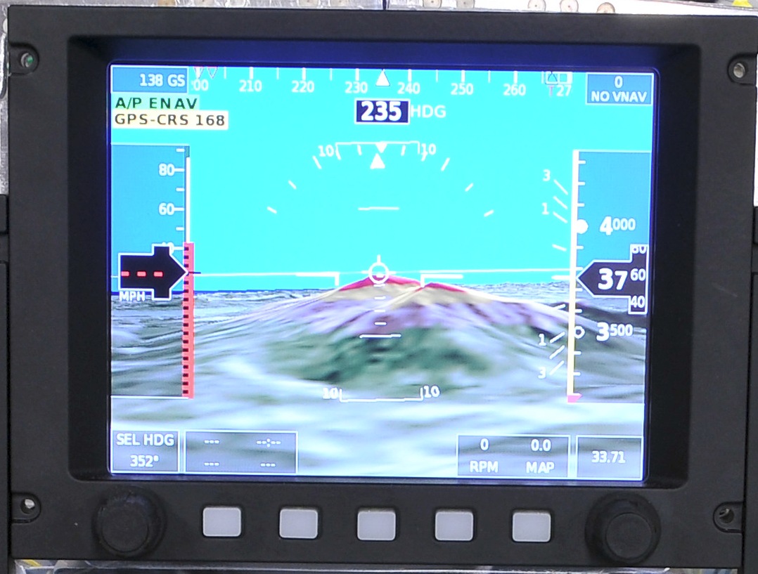 The panel on the RV-8 got the first power up today. I interconnected all of the major instrument panel devices to the Vertical Power VP-200 electrical system and powered everything up. In the center screen, you can see Mt Diablo in California. I was playing back a flight from a portable GPS I use in the rental plane. Notice the top of the mountain is RED which means that its above our current altitude (from the playback). The Kenwood is playing a James Bond movie...