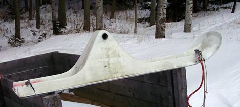 Picture 3. This angle shows the axel is straight and it also shows the two thin Teflon plastic runners on the bottom of the ski. Notice no whear bars as the skis are not to be used on bare pavement.